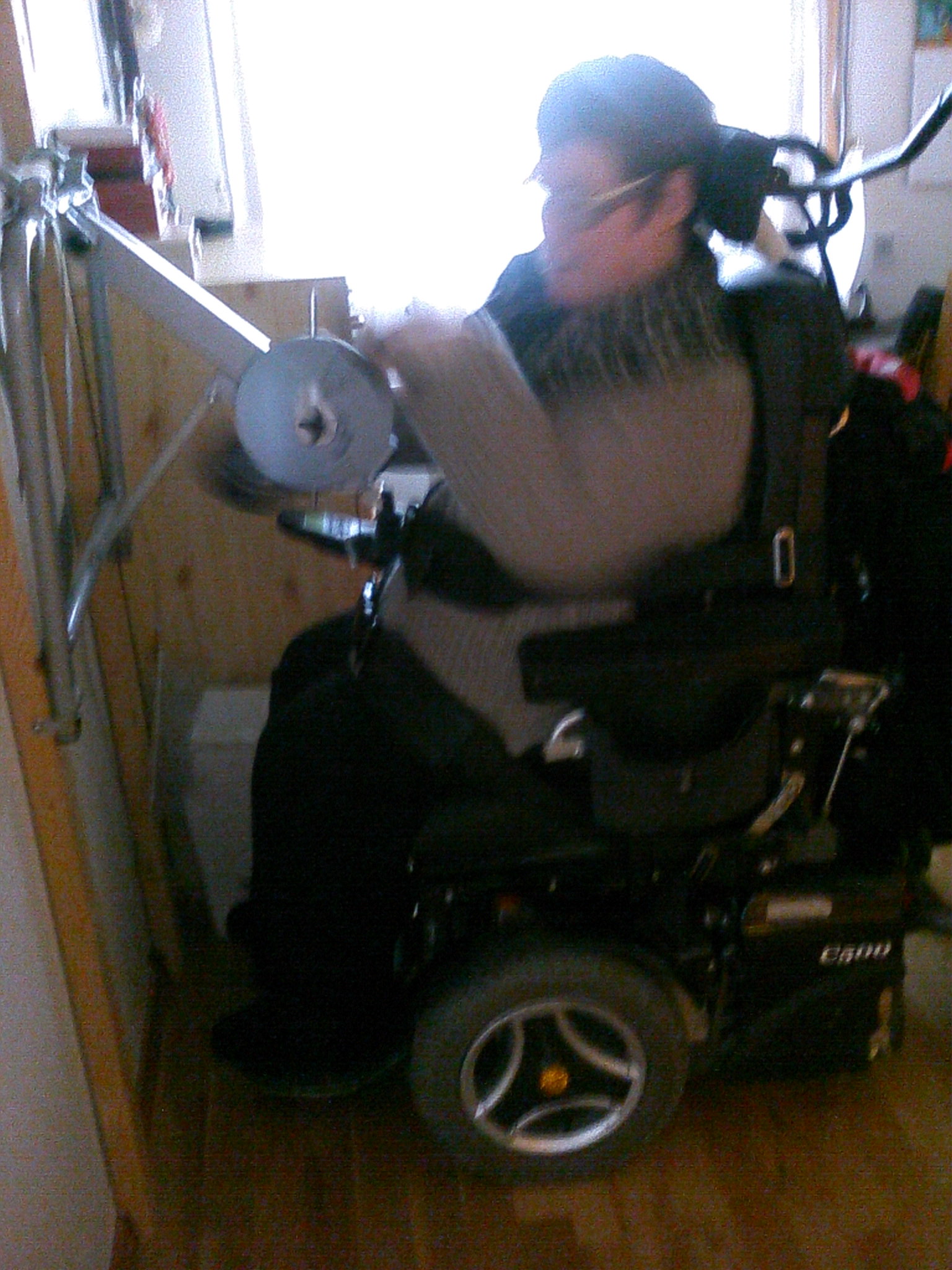 The week end is getting closer. Like in the last chapter of «Maiken’s training sessions», I am attaching pictures from earlier today in the Norwegian version above. In addition to exercising to maintain mobility in my arms, I blow air into a catheter bag with a little cut-out hole in it, to strengthen my lungs.